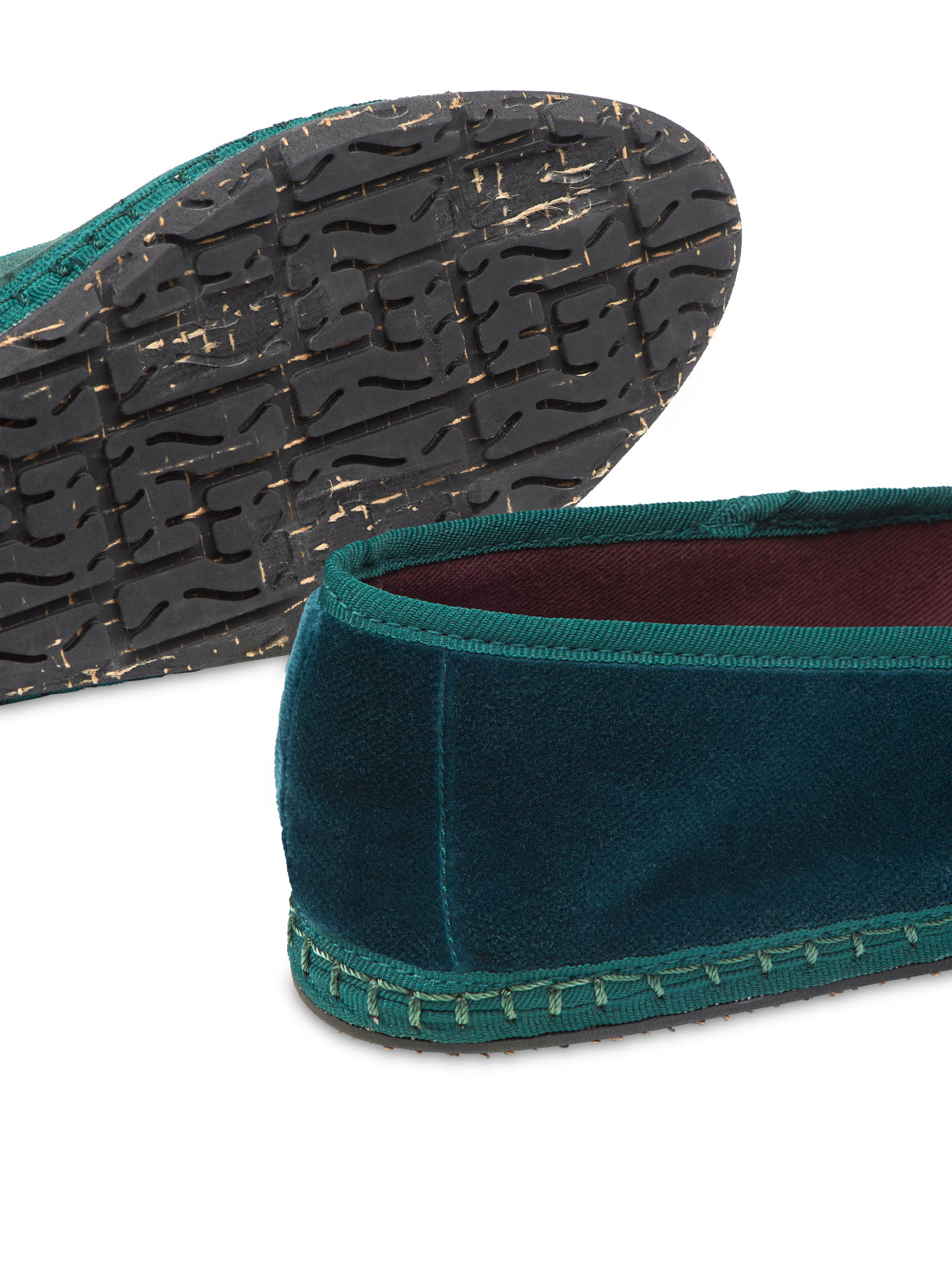 Bernarda Velvet Slip-On in petrol green with dark green piping. The outside of the shoe is 100% cotton velvet, and the inside of the shoe is 100% organic cotton with anti-bacterial treatment. The sole is made of rubber produced from recycled bicycle tires.
