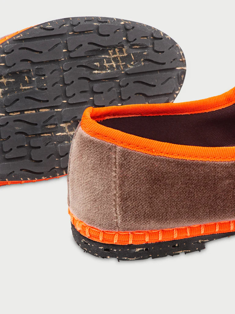 Cora Velvet Mary Jane in beige with neon orange piping and buckle closure. The outside of the shoe is 100% cotton velvet, and the inside of the shoe is 100% organic cotton with anti-bacterial treatment. The sole is made of rubber produced from recycled bicycle tires.