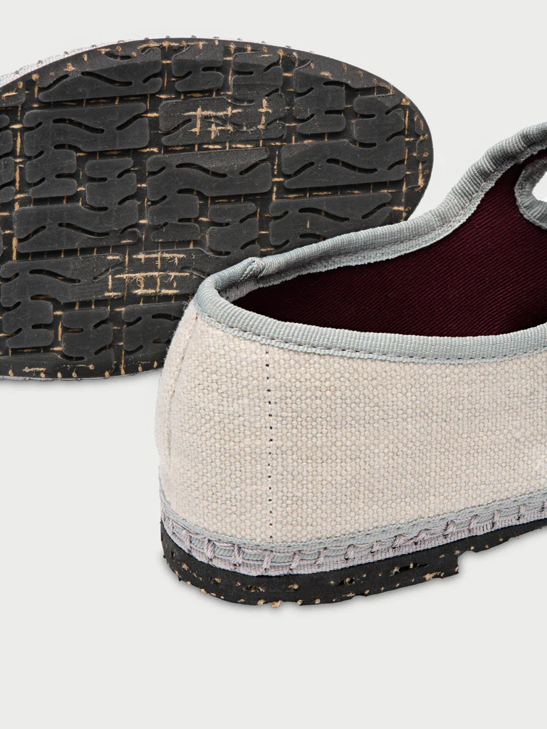 Dalloway Linen Mary Jane in white with light grey piping and buckle closure. The outside of the shoe is 100% linen, and the inside of the shoe is 100% organic cotton with anti-bacterial treatment. The sole is made of rubber produced from recycled bicycle tires.