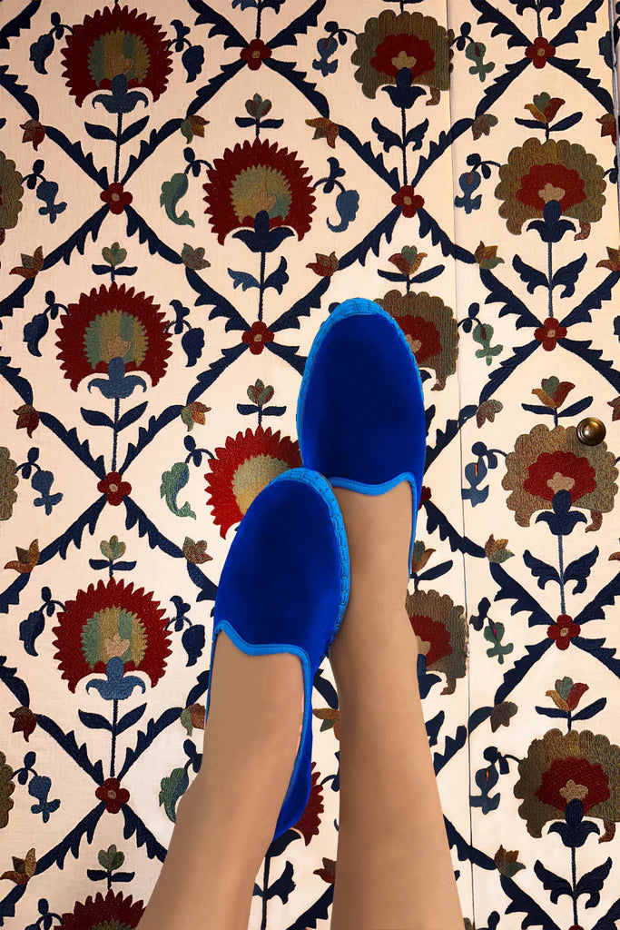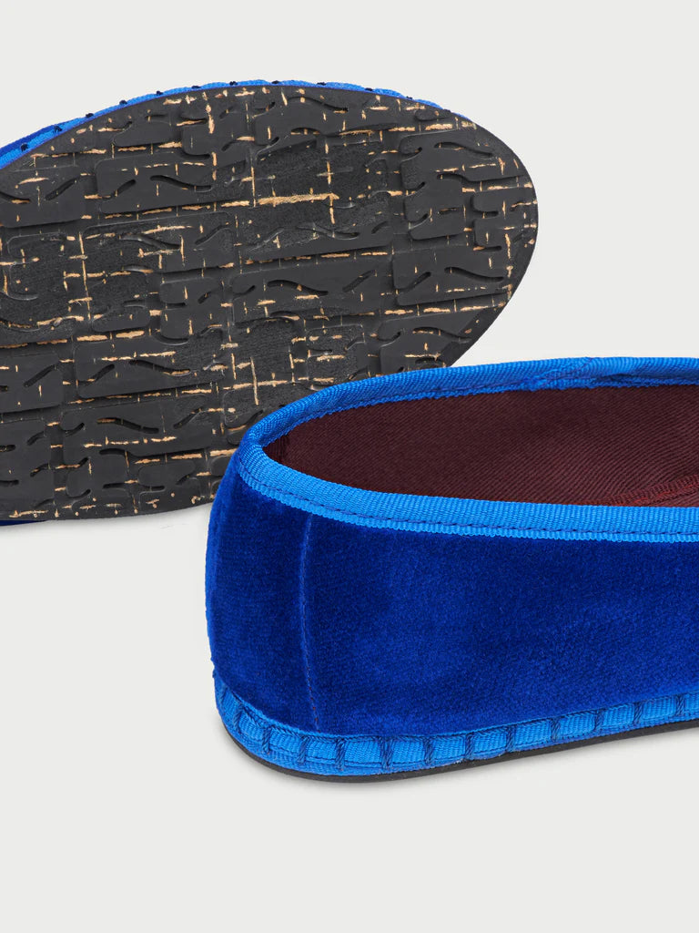 Electra Velvet Slip-On in blue with blue piping. The outside of the shoe is 100% cotton velvet, and the inside of the shoe is 100% organic cotton with anti-bacterial treatment. The sole is made of rubber produced from recycled bicycle tires.