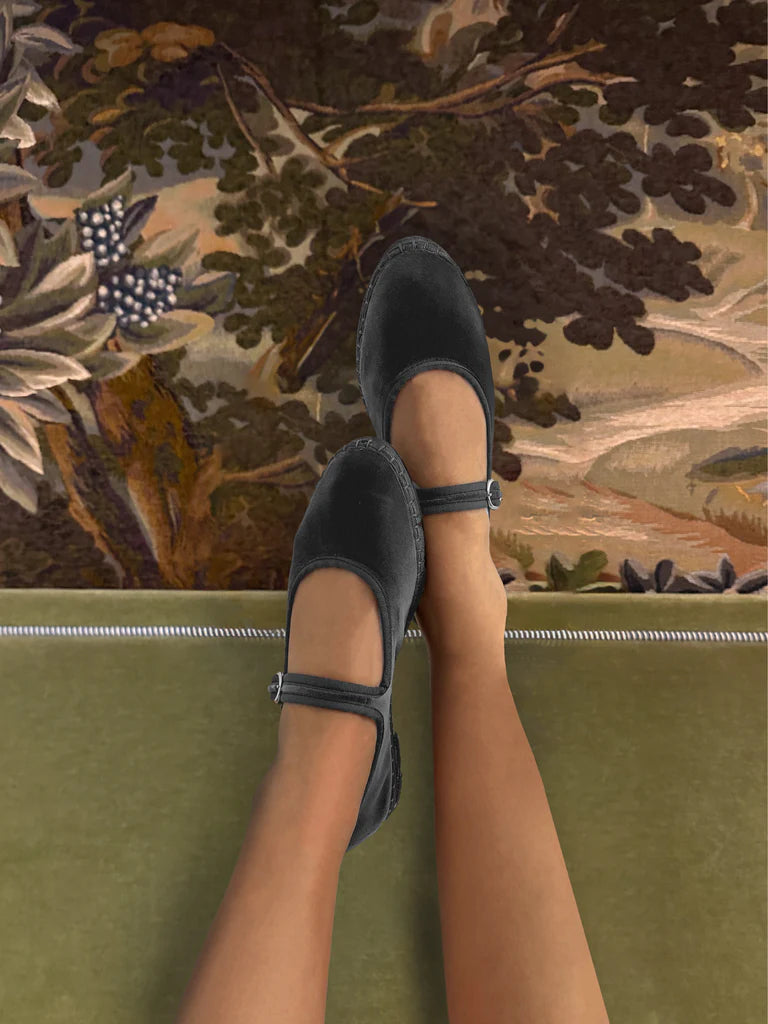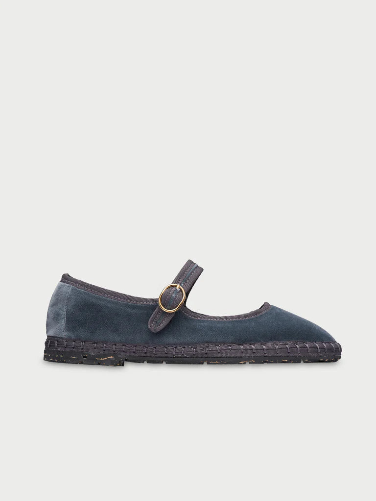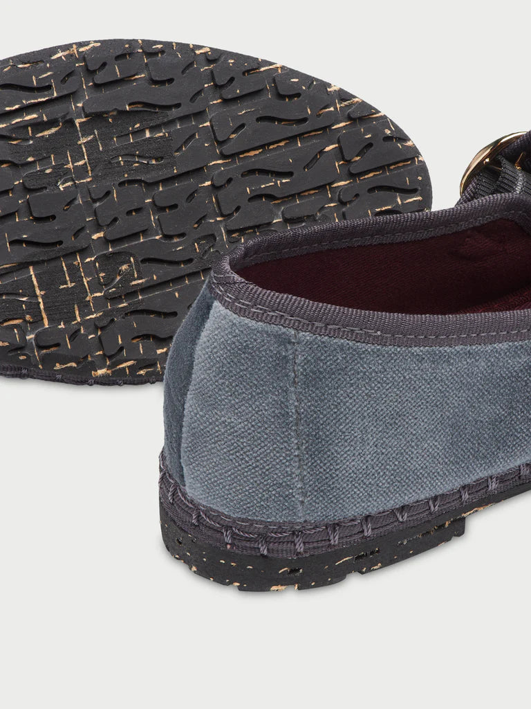 Javert Velvet Mary Jane in grey with grey piping and buckle closure. The outside of the shoe is 100% cotton velvet, and the inside of the shoe is 100% organic cotton with anti-bacterial treatment. The sole is made of rubber produced from recycled bicycle tires.