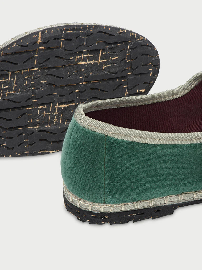 Jay Velvet Mary Jane in green with light green and buckle closure. The outside of the shoe is 100% linen, and the inside of the shoe is 100% organic cotton with anti-bacterial treatment. The sole is made of rubber produced from recycled bicycle tires.