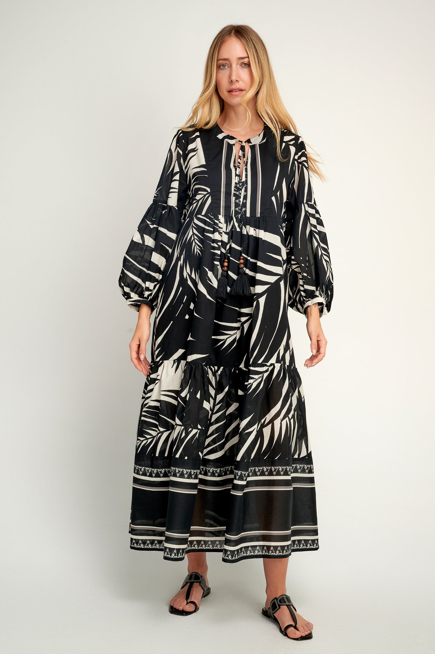 This stunning bohemian maxi dress effortlessly combines elegance and ease. Crafted from lightweight, breathable fabric, it features a bold black and white tropical-inspired print.