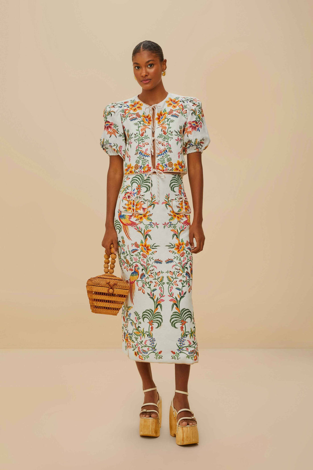 Discover the Off-White Delicate Forest Scarves Euroflax™ Premium Linen Blouse by FARM Rio. Crafted from responsible materials, this enchanting piece boasts vibrant floral patterns and a charming round neckline. Delight in the voluminous puff sleeves and the playful front ties that exude effortless elegance. Immerse yourself in the rich tapestry of colors and let the delightful design carry you through any occasion with grace and style.