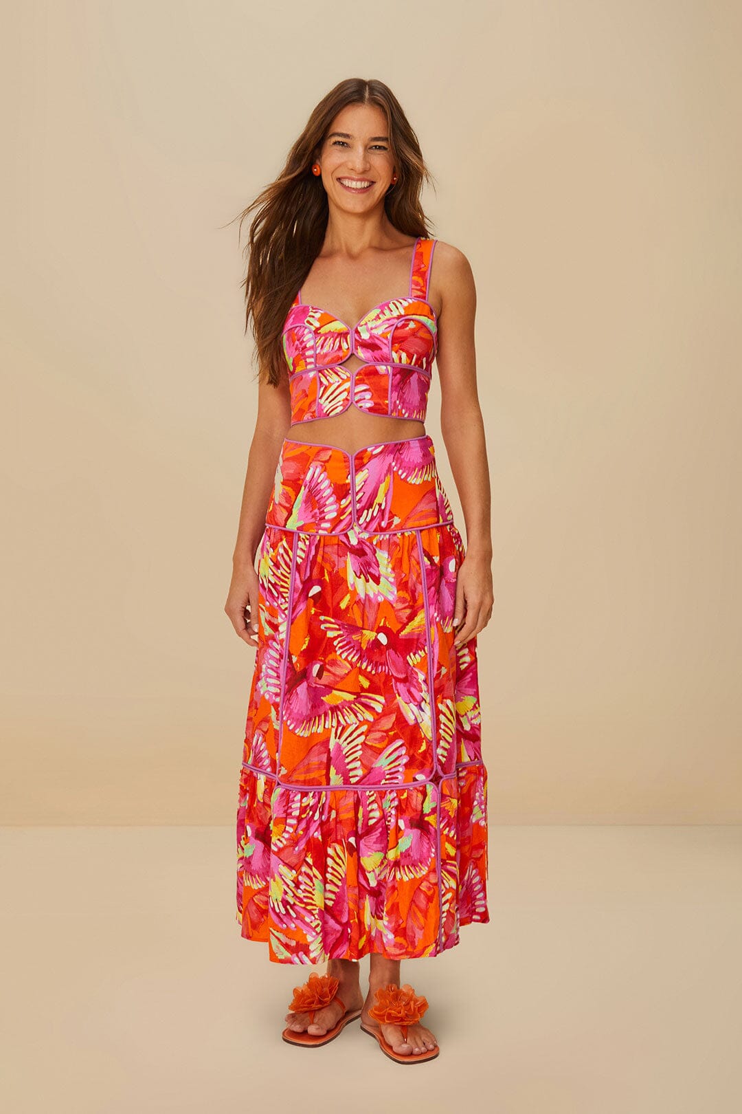 The Orange Flying Birds LENZING™ ECOVERO™ Euroflax™ Crop Top enchants with its vibrant palette of orange, pink, and hints of green, capturing the essence of exotic avian beauty. Its sweetheart neckline and structured design offer a playful elegance, perfectly complemented by the bright, bold bird pattern. Crafted from responsible materials, this crop top is a radiant expression of artful design, inviting joy and warmth into every moment.