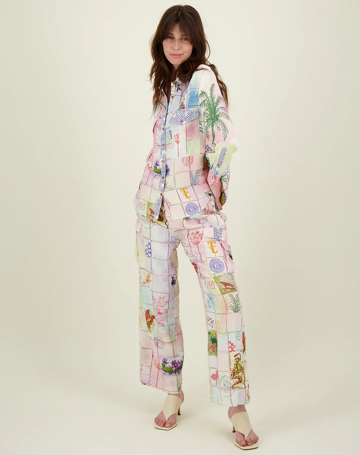 Frida Linen Cargo Pants featuring 2 side pockets, 2 pockets with flaps and 2 back pockets. Waistband is elasticized. Print is in pastels with a large background check and animals and plants in the foreground.
